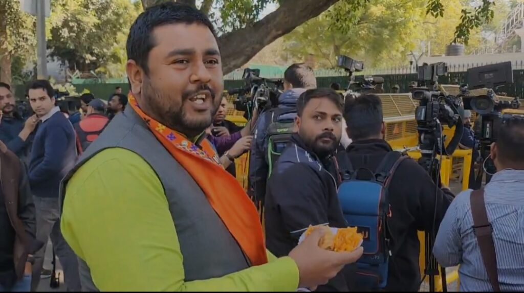 दैनिक किरनः बीजेपी ने दिल्ली चुनाव प्रचंड बहुमत से जीत लिया है। इस बीच बीजेपी समर्थकों का जमकर उत्साह देखने को मिल रहा है। जगह-जगह पर ढोल नगाड़े और पटाखे फोड़े जा रहे हैं। वहीं एक बीजेपी कार्यकर्ता जलेबी और समोसे लेकर अरविंद केजरीवाल के घर के बाहर पहुंच गया। उसने कहा कि जीत की बधाई देते हुए केजरीवाल को जलेबी और समोसे खिलाने आया हूं।