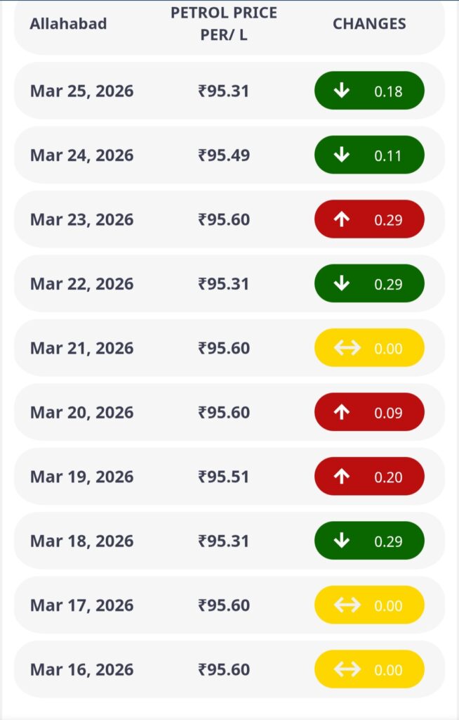इलाहाबाद में आज पेट्रोल की कीमत 95.31 रुपये प्रति लीटर है. पिछले 10 दिन में इलाहाबाद में पेट्रोल की कीमतें 95.60 रुपये प्रति लीटर से 95.31 रुपये प्रति लीटर हुई हैं. अगर हम पिछले महीने की कीमत की तुलना आज की कीमत से करें तो दाम में 0.29 फीसदी की कमी हुई है.